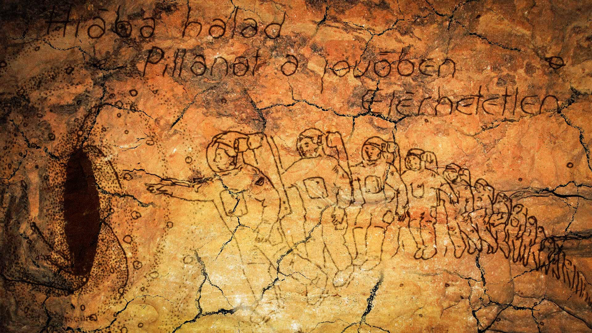A bal oldalon Szabó Eszter Ágnes Idődilatáció című, 2020-ban a Ludwig Múzeumban kiállított hímzett falvédője látható, amelyet saját értelmezésemben barlangrajzzá alakítottam át.