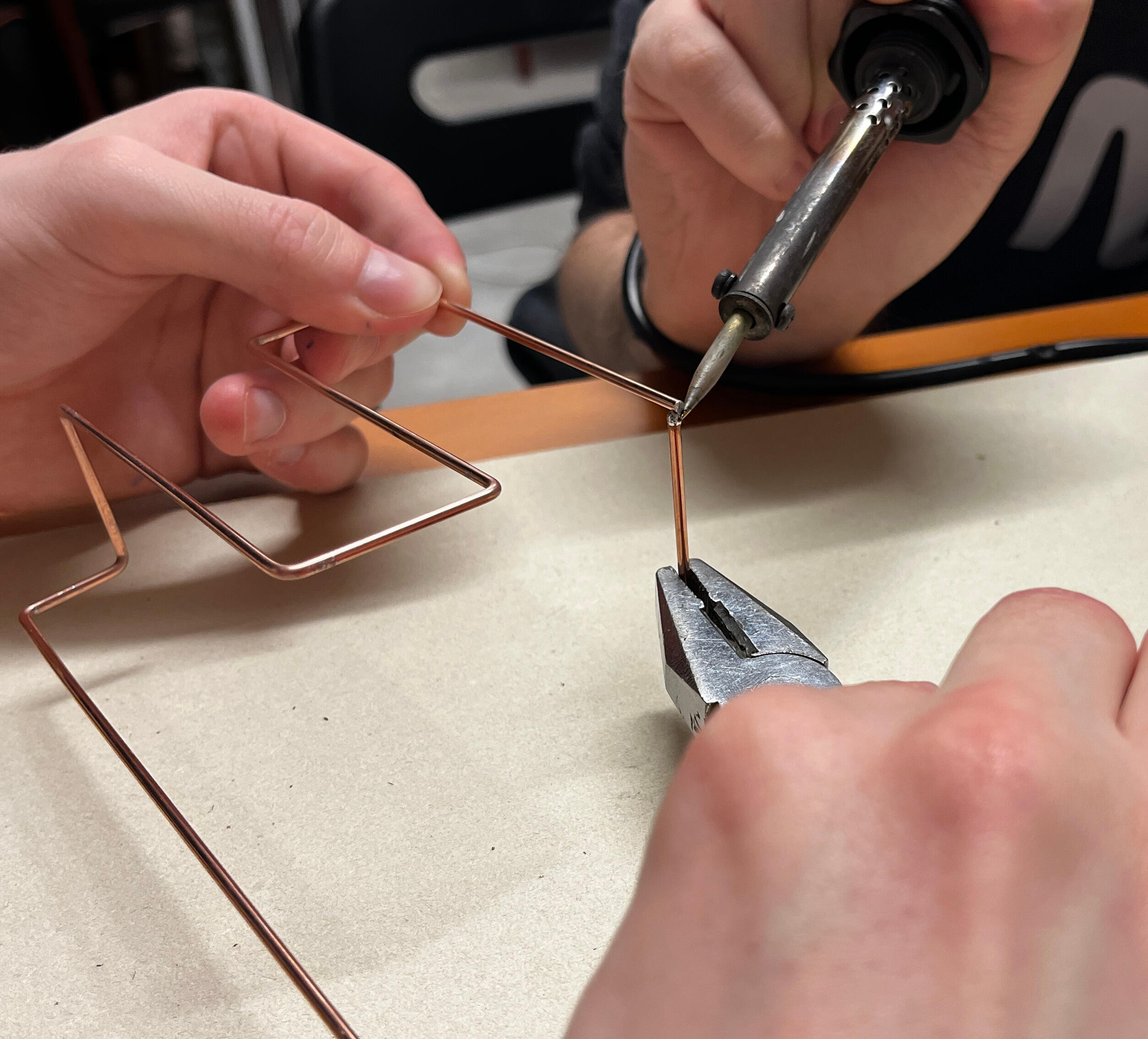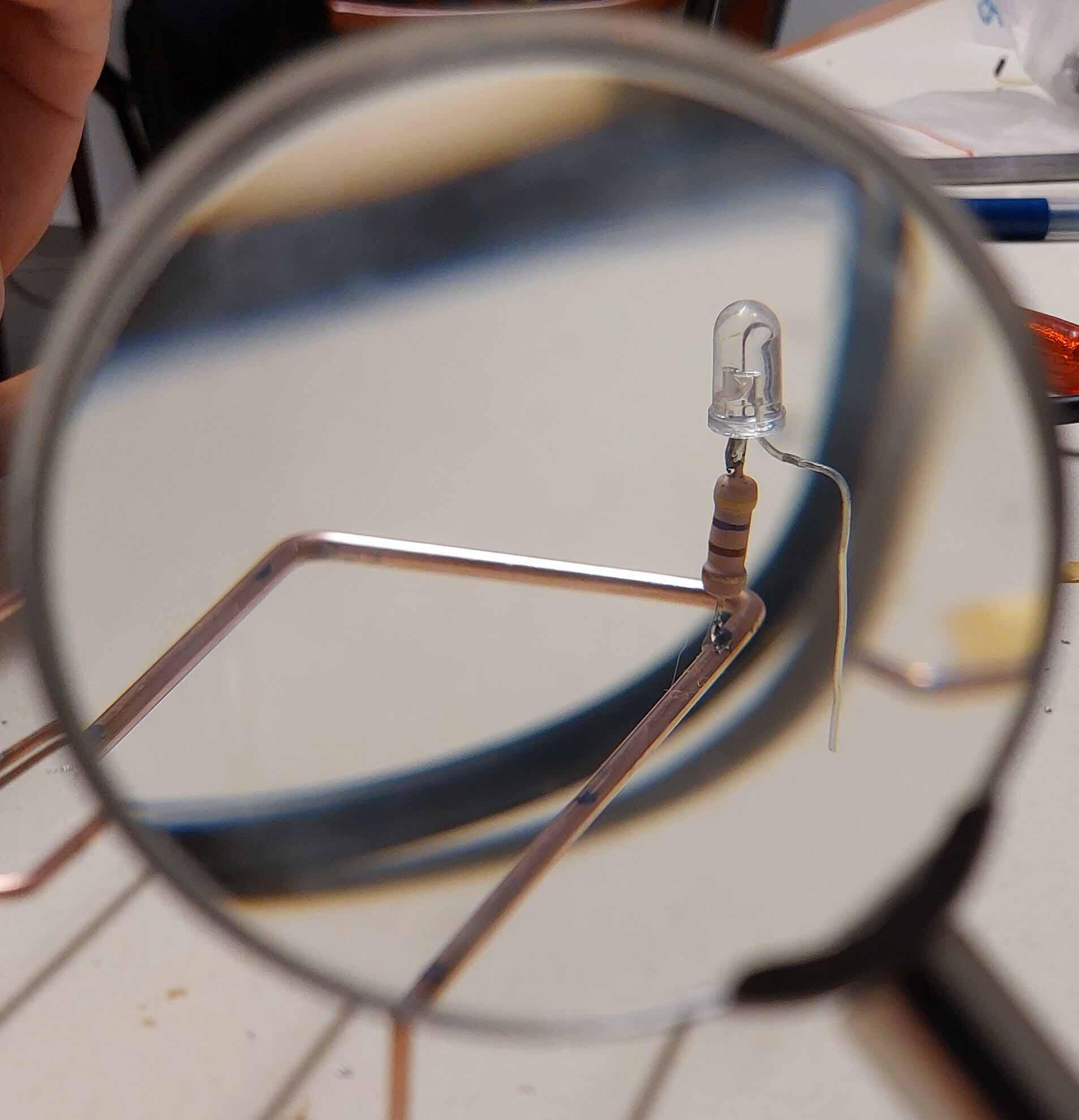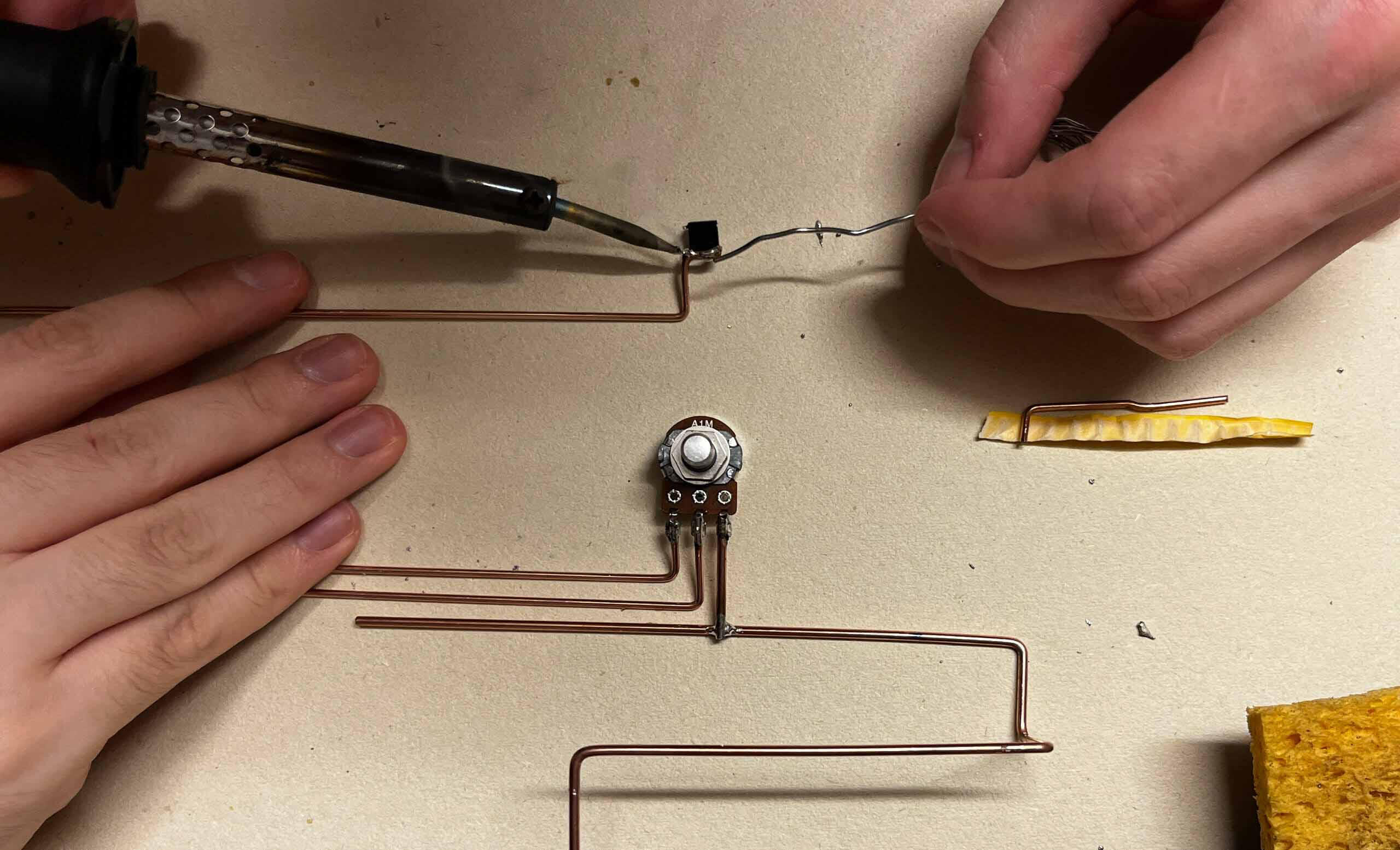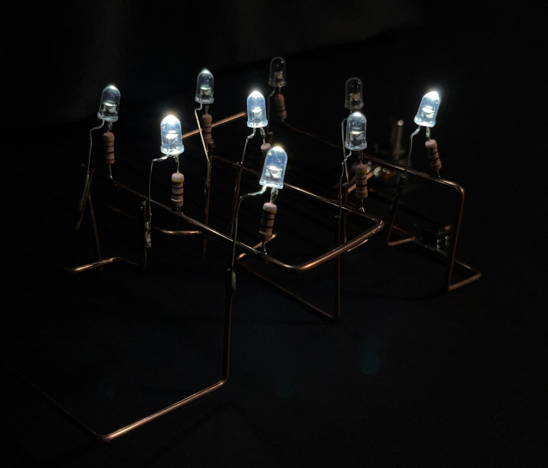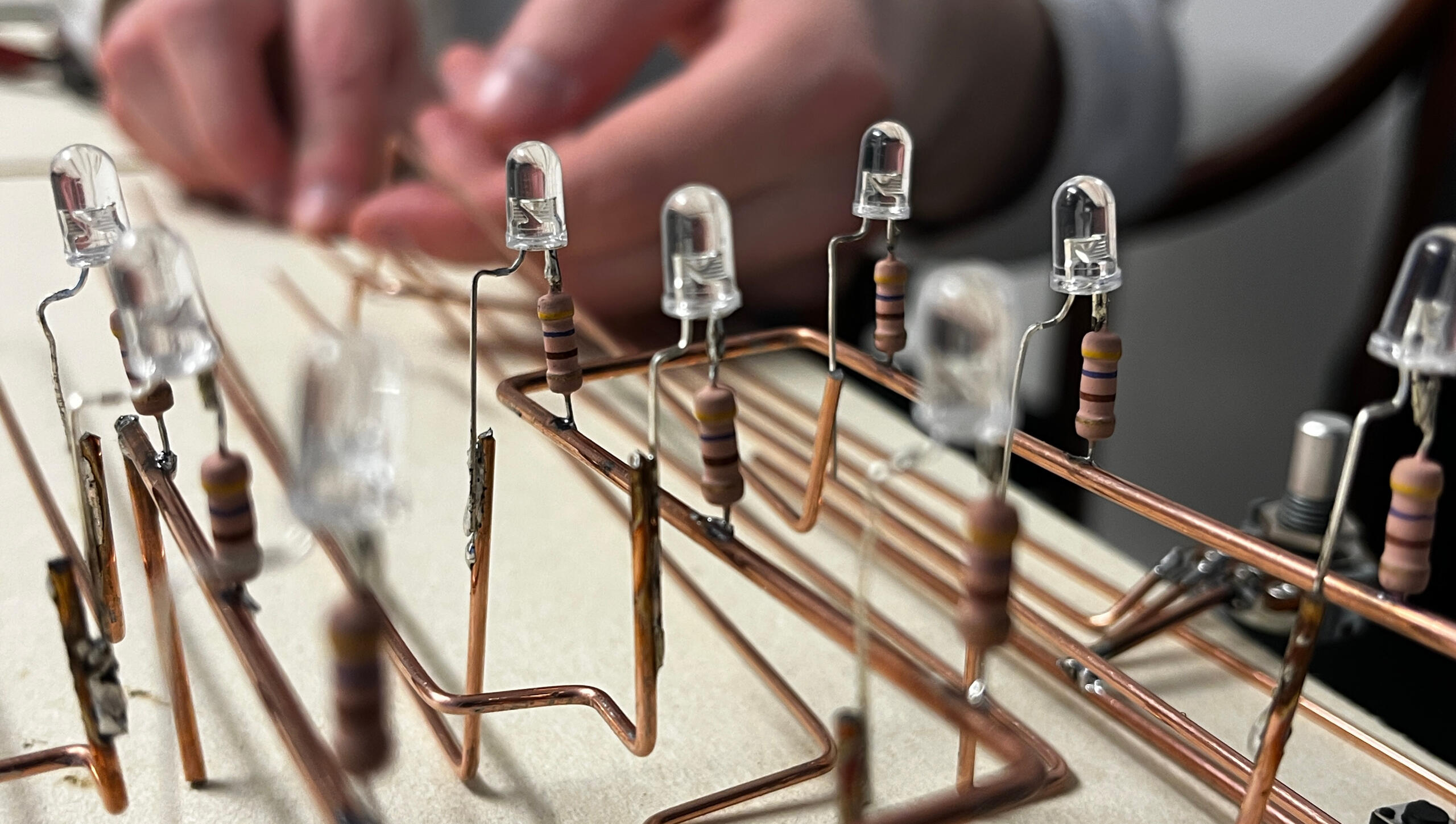 Az installációban egy potmétert, egy nyomógombot és kilenc LED-et használtunk fel, ezek rézpálcákkal és vezetékekkel kerültek összekötésre. A célunk egy egyszerű, mégis működőképes és kézzel vezérelhető játék létrehozása volt, amely a digitális technológia és az analóg interakció határán mozog. A projekt nemcsak technikai kihívásokat jelentett, hanem tervezési és vizuális döntésekben is komplex feladatot adott.