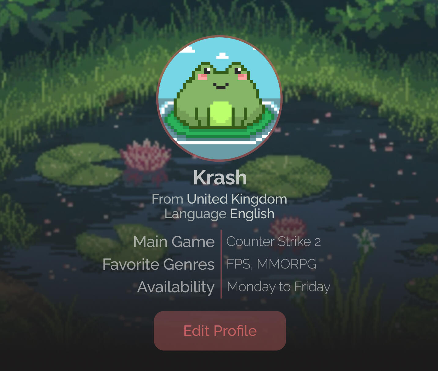 A cél egy olyan platform létrehozása volt, ahol a gamerek játékostársakat vagy akár új barátokat találhatnak. A projekt a kutatási szakasztól indulva a felhasználói igények feltérképezésén, wireframe készítésen és prototípusfejlesztésen át vezetett a kész alkalmazás vizuális megvalósításáig.